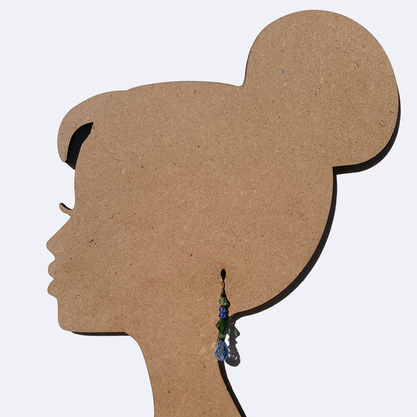 Light blue iridescent earrings. Faceted light sapphire Austrian crystal drop earrings with an iridescent shine. Accents are Austrian crystal, Czechoslovakian and German glass in shades of sapphire, peridot and tourmaline green. "Style 500" earrings measure 1 3/4 inches long. Antiqued bronze metal trim with sterling silver ear wires. All hand work done in the USA.