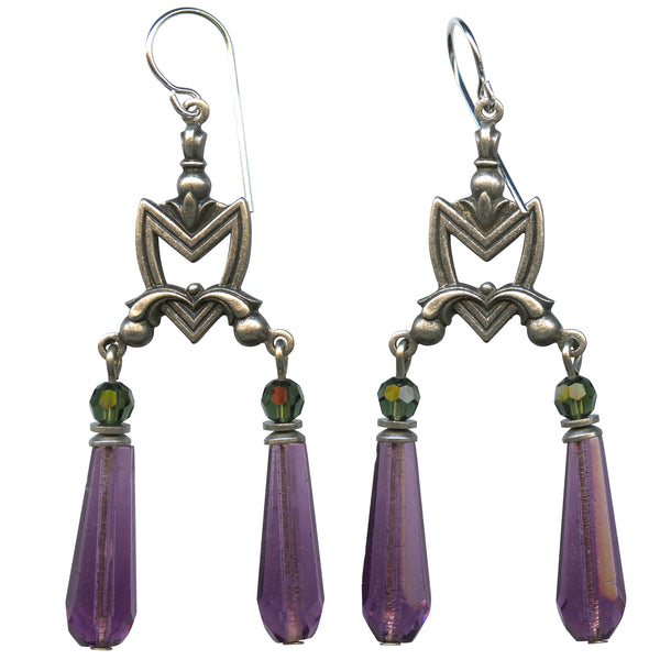 Amethyst glass earrings. Antique Czech glass beads, circa 1920-1930, with tourmaline green Austrian crystal top beads. Antique silver dipped filigree with sterling silver ear wires. "Arcadia 24" earrings measure 2 inches long. All handwork done in the USA.