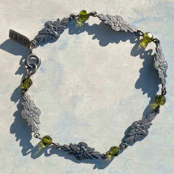 Olivine crystal bracelet. Antiqued silver dipped filigree bracelet with olivine green Austrian crystal accents. "Grace 7" bracelet measures 6 1/2 inches long. All handwork done in the USA.