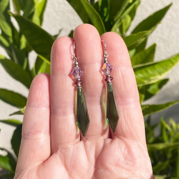 Green and purple earrings. Tourmaline green German glass drops with Austrian crystal and Czechoslovakian glass accents in light amethyst. Metal trim is antique silver dipped, from our own tooling. Style 245 earrings measure 1 3/4 inches long. Sterling silver ear wires. All hand work done in the USA.