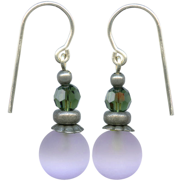 Periwinkle and green earrings. Frosted light amethyst German glass drops with tourmaline green Austrian crystal accents. "Bubbles 17" earrings measure 3/4 inches long. Antiqued silver plated trim with sterling silver ear wires. Handmade in the USA using German glass from our collection.