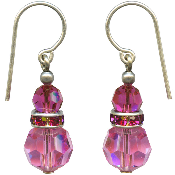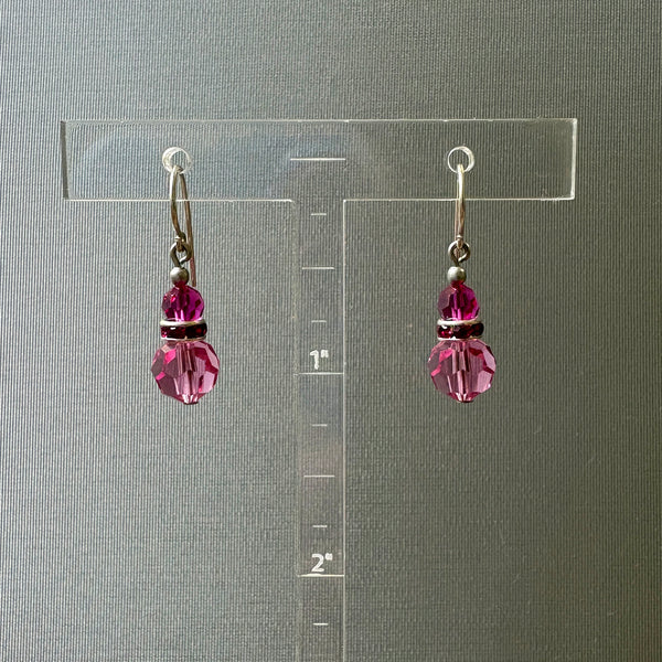 Pink crystal earrings. Pink and fuchsia Austrian crystal beads with fuchsia rhinestone accents. "Flash 18" earrings measure 7/8 inches long. Ear wires are sterling silver. All handwork done in the USA.