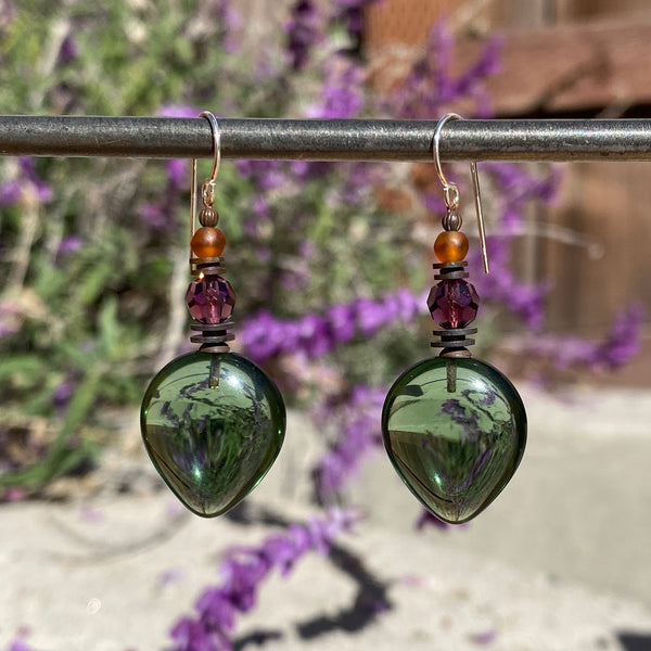Tourmaline green glass earrings. Green German glass drops, from our collection. Focal beads in amethyst are Austrian crystal with frosted topaz Czech glass top beads. Metal trim is antiqued bronze, from our own tooling, with sterling silver ear wires. "Almonds 13" earrings measure 1 1/2 inches long. All handwork done in the USA.