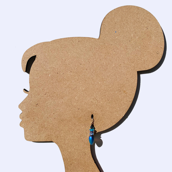 Iridescent blue dangle earrings. Frosted indigo blue glass drops, designed by Allen Owen and made for us in Germany, with an iridescent sheen. Shades of blue and turquoise Czech glass accents with Austrian crystal indigo blue top beads. Tango 66 earrings measure 1 1/4 inches in length. Metal trim is antiqued bronze, ear wires are sterling silver. All handwork done in the USA.